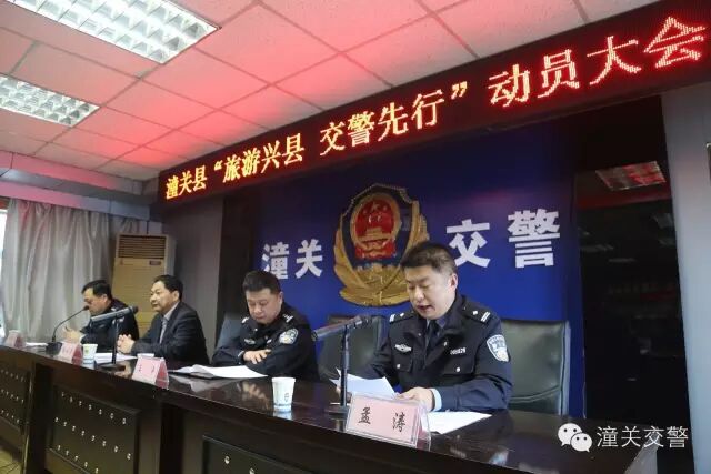 会议由县公安局政委姬刚民主持,会议首先由县公安局副局长、交警大队大队长孟涛同志作动员讲话,孟涛同志讲到,为积极响应县委、县政府旅游兴县战略目标,打造文化旅游名县,交警大队向全体民警发出“我为旅游兴县做贡献,我为旅游兴县添光彩”的号召,在全大队开展“旅游兴县,交警先行”活动,孟涛同志宣布:潼关交警对所有来潼旅游观光、投资购物车辆体现人性化执法,对轻微违法行为,一律只纠违,不处罚。孟涛同志同时讲解了交通民警对待外地旅游车辆具体执法要求。孟涛同志要求全体交通民警明确职责,忠于职守,坚守岗位,为实现旅游兴县目标做出突出贡献。交警大队城区中队、矿区中队中队长分别在大会上表态发言。在热烈地掌声中,县委常委、县政法委书记孙永亮作了重要讲话,孙书记指出,今天的会议是经县委主要领导同志召开的,会议邀请涉及“旅游兴县”的部门领导参加。孙书记就我县实施“旅游兴县”战略目标讲了四点意见:一是统一思想,提高认识;二是要进一步加大领导力度;三是齐抓共管,密切配合;四是要加强旅游兴县宣传工作,孙书记最后要求各涉及“旅游兴县”部门,要学习交警先行精神,团结一致,齐心协力,确保实现县委、县政府提出的旅游兴县战略目标,为潼关经济社会创新转型发展做出积极的贡献。