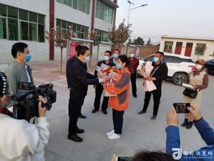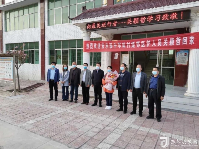4月8日下午,渭南潼关县安乐镇镇村干部欢迎援鄂医护人员中军帐七组的最美逆行者关颖哲安全回家,县政府副县长张力、卫健局局长兰拴启参加欢迎仪式。