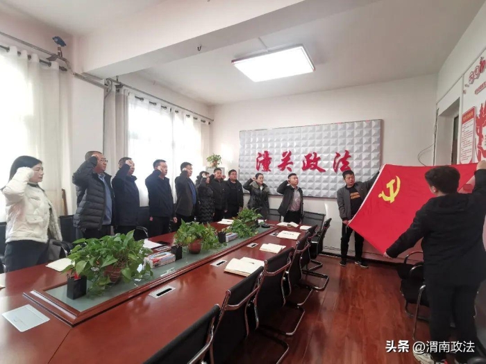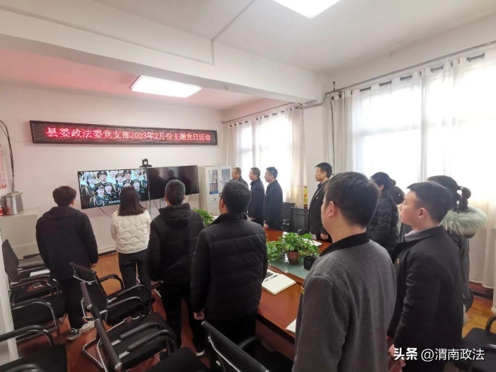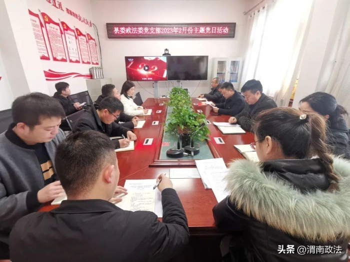 在机关会议室,全体党员干部听唱主题歌曲《前进吧,中国共产党》并重温入党誓词;集中学习了党的二十大报告中关于《发展全过程人民民主,保障人民当家作主》和《关于进一步加强党建引领完善网格化管理,推进城乡“治理一张网”建设社会治理共同体的实施方案》;讨论完善2023年政法工作要点和机关信息考核奖惩制度;党员代表结合近期春训学习心得和个人工作、生活经验进行了感悟分享;足额交纳了2月份党费。