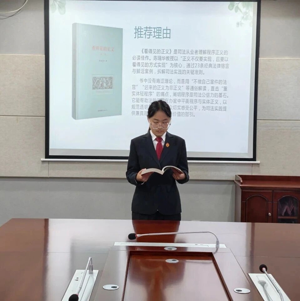 六名干警从不同角度阐述了各自对推荐书籍的理解和感悟,有的分享了书中的精彩段落,有的讲述了自己从书中获得的启示和力量,有的则结合工作实际,探讨了如何将书中的理论知识运用到司法实践中。