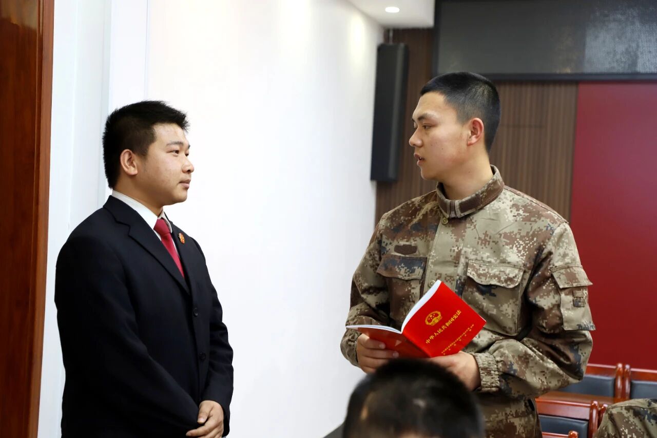 活动现场氛围热烈,普法宣讲干货满满、互动频频。干警靳文博紧扣预定新兵的实际需求,聚焦《中华人民共和国兵役法》《中华人民共和国国防法》《中华人民共和国军人地位和权益保障法》以及《中国人民解放军纪律条令》等法律法规,结合典型涉军案例,用接地气的语言重点讲解依法服兵役义务、军人权益保障、涉军纠纷化解等内容。