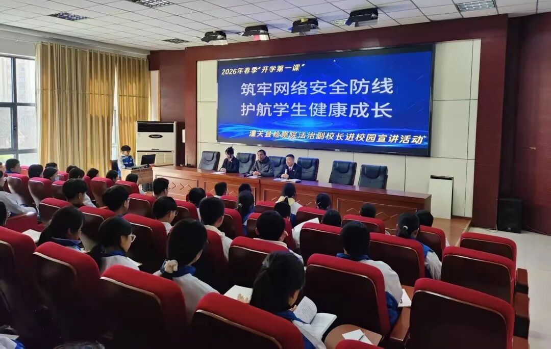 春启校园,安全先行。为守护青少年健康成长,2026年3月18日,潼关县四知学校特邀我校法治副校长、潼关县人民检察院副检察长周彦荣,开展2026年春季“开学第一课”网络安全法治宣讲活动,为全校师生带来一场干货满满的网络安全知识课。